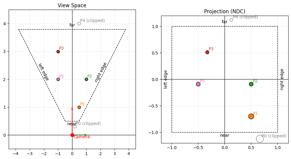 Notice how P0 and P4 fall outside the visible range — P0 is closer than the near plane and P4 is farther than the far plane, so both will be clipped and won't appear in our final NDC (normalized device coordinates) frame.