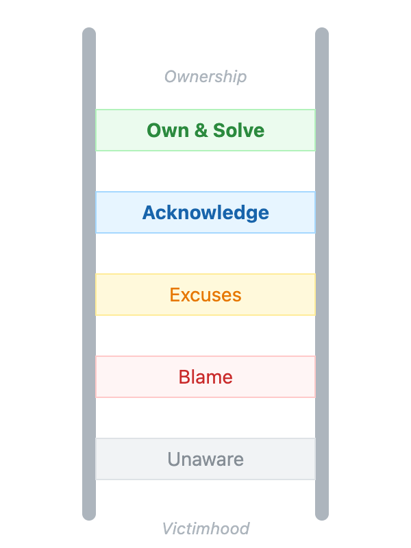 Accountability is a person's relationship to the outcomes they produce. The Accountability Ladder maps the mindsets people adopt when facing challenges, ranging from the bottom rungs of Unaware, Blame, and Excuses to the higher rungs of Acknowledge and Own and Solve. Your goal is to help team members climb this ladder by modeling ownership yourself and using targeted coaching questions to move them from externalizing problems to proposing solutions.