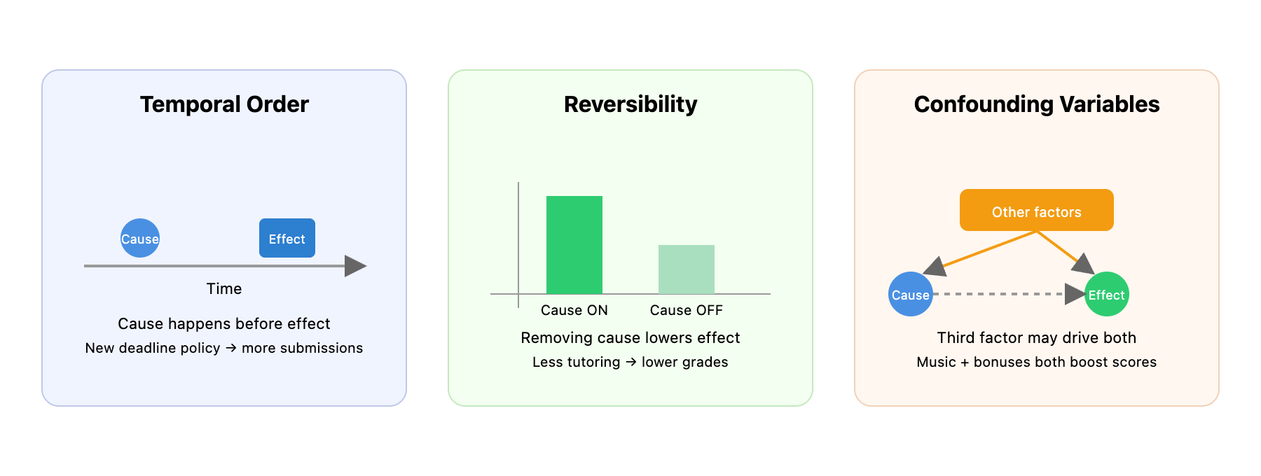 Remember that timing matters: Did the supposed cause happen before the effect? If assignment submissions increased after a new deadline policy, that supports causation. But if submissions were already rising, look for other explanations.