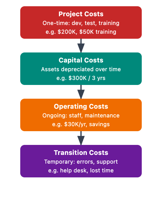 There are two main cost types you’ll need to estimate: project costs (which include both project-specific and capital expenditures) and operating costs. Project costs are typically one-time investments needed to launch or implement your solution, such as equipment purchases, software licenses, or consulting fees. Capital expenditures (CapEx) are larger, long-term investments in assets like machinery or infrastructure. Operating costs (OpEx), on the other hand, are ongoing expenses required to keep the project running—such as salaries, maintenance, and utilities.