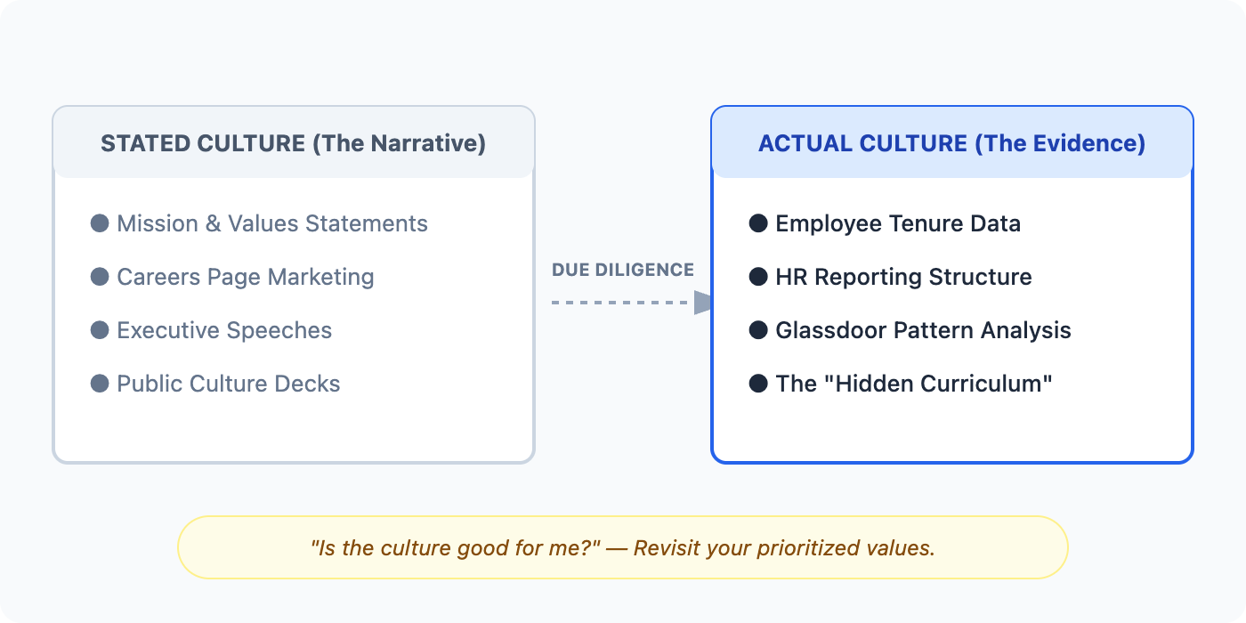 Every organization has a stated culture and an actual culture. Public materials like mission statements and culture decks provide the official narrative, but these are only meaningful if they are reflected in daily operations. To bridge the gap between what a company says and what it does, you must perform cultural due diligence.