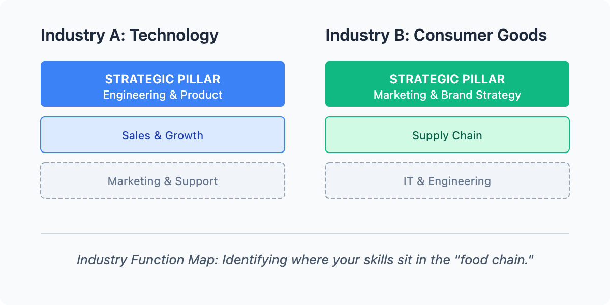 A practical tool is the Industry Map. Start with three to five sectors that interest you, then list the primary functions within each. You might discover that experience in "Manufacturing" has direct parallels to roles in "Logistics" or "Operations". This shifts your focus from being locked into one sector to seeing your skills as portable assets. As you build this map, also consider organizational scale; a role at a 50-person startup functions differently than the same title at a 10,000-person corporation. The following diagram illustrates how the same skill sets may apply to different industry roles: