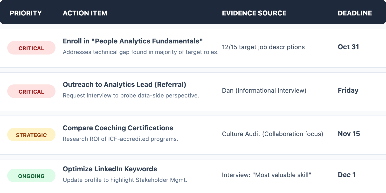 Translate these patterns into a prioritized action list. Each action should be specific and time-bound. Instead of "Learn analytics," write: "Enroll in a people analytics course by month-end to address the gap identified in 70% of target postings." For example, your list may look like: