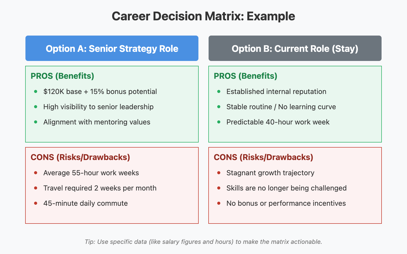 To build one, start by listing your career options as columns, then brainstorm the pros (benefits, advantages, things that excite you) and the cons (drawbacks, risks, things that concern you) for each option. The key here is specificity. Instead of writing "good salary", write "base salary of \$120K with 15% bonus potential". Instead of "long hours", write "average 55-hour weeks with travel two weeks per month". This level of detail is what transforms a casual list into a decision-grade tool.