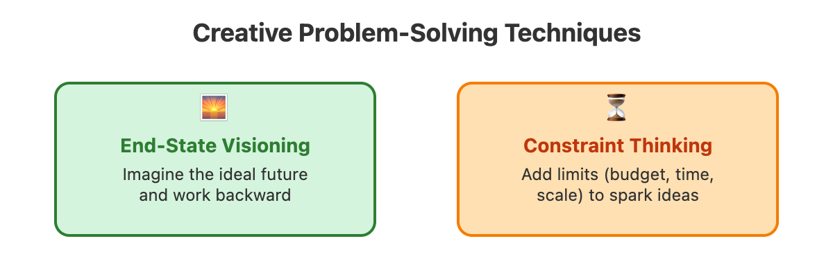 End-state visioning asks you to imagine the ideal future state and work backward. Instead of "How do we fix our inventory system?" ask, "What would perfect inventory management look like?" This often unlocks creative thinking and reveals solutions you might not have considered.