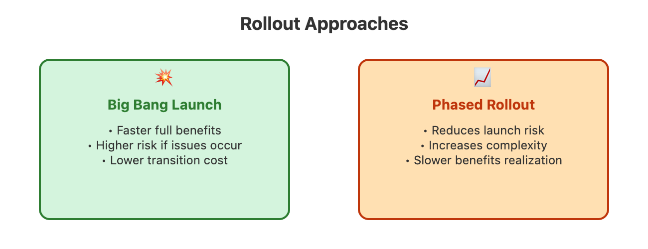 Once you have identified any major pre-work, decide on your rollout approach: a “big bang” launch or a phased rollout: