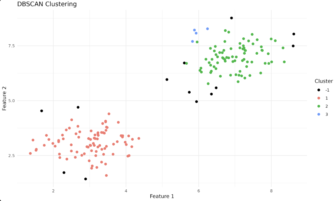 We represent grouped and non-grouped (Noise) data points using the ggplot2 library. Here, -1 marks Noise and is colored black.