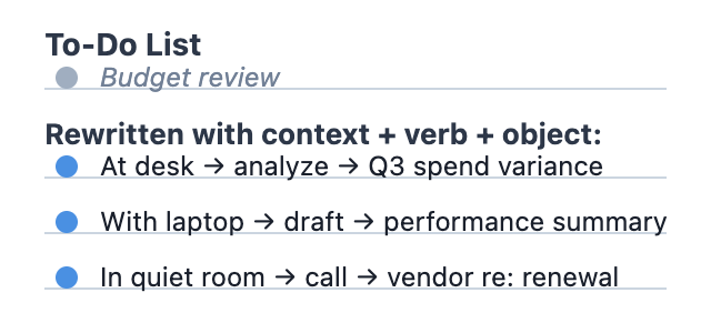 The transformation of your to-do list begins with a simple but powerful formula: context + verb + object. This structure forces you to define exactly where you'll work, what action you'll take, and what specific outcome you'll produce. Compare the vague task list with the actionable task list in the image below: