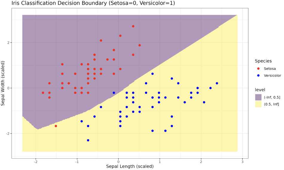 The plot above shows the decision boundary learned by our model. The regions are colored according to the predicted class, and the points represent the actual data points, with color indicating their true class.