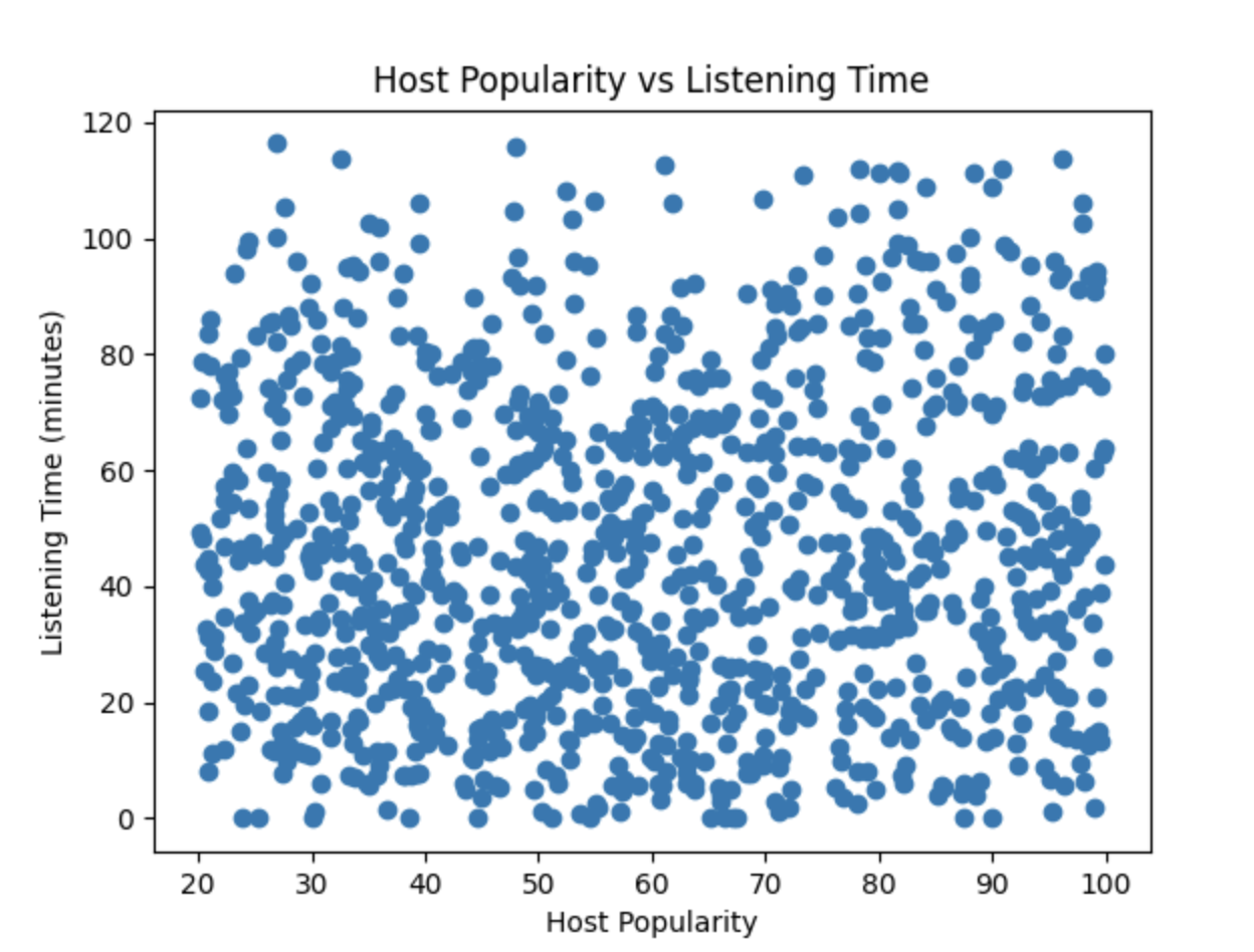 In this scatter plot, the points are widely dispersed without forming any clear pattern or trend. This visual spread indicates that there is little to no linear relationship between Host_Popularity_percentage and Listening_Time_minutes. The lack of a visible association supports the low correlation value observed earlier, suggesting that host popularity is not a strong predictor of listening time in this dataset.