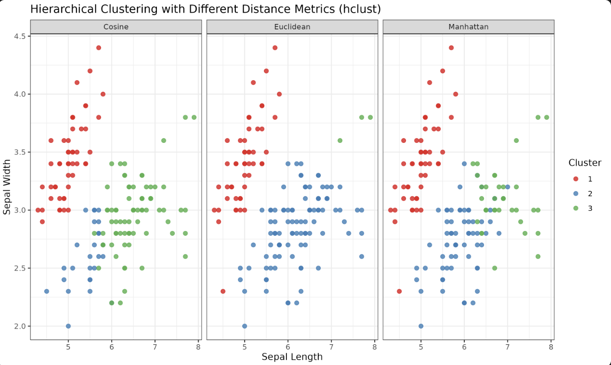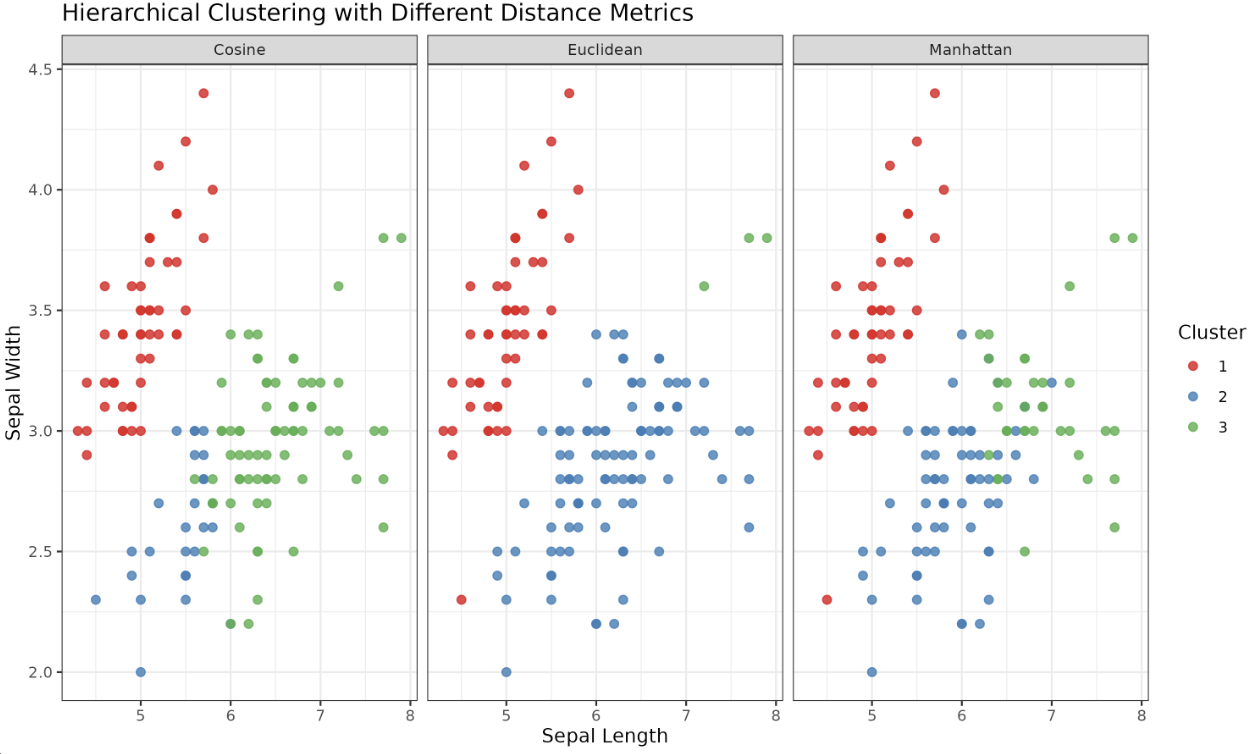 Excellent work! You've just mastered the concepts and the importance of distance metrics in hierarchical clustering. You've implemented these metrics in R and applied them in the agglomerative clustering algorithm. In the end, you studied the impact of these distance metrics on the clustering results using ggplot2 for clear and effective visualization. Next, get ready to solidify this knowledge through related exercises!
