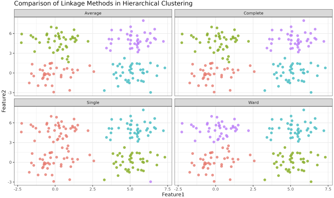 By comparing these panels side by side, you can clearly see how the choice of linkage method affects the shape, size, and separation of the resulting clusters. This visual comparison is a powerful tool for understanding which linkage method might be most appropriate for your data and analysis goals.