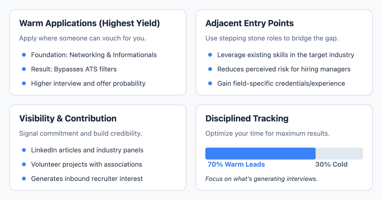 - Warm Applications: This is your highest-yield activity. Instead of cold-applying, focus on roles where you have a direct or indirect connection. By using informational interviews to secure an internal referral, you often bypass the automated filters that would otherwise reject a non-traditional resume, significantly increasing your probability of landing an interview.