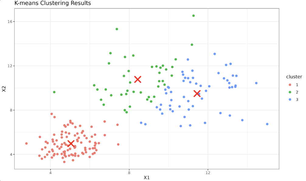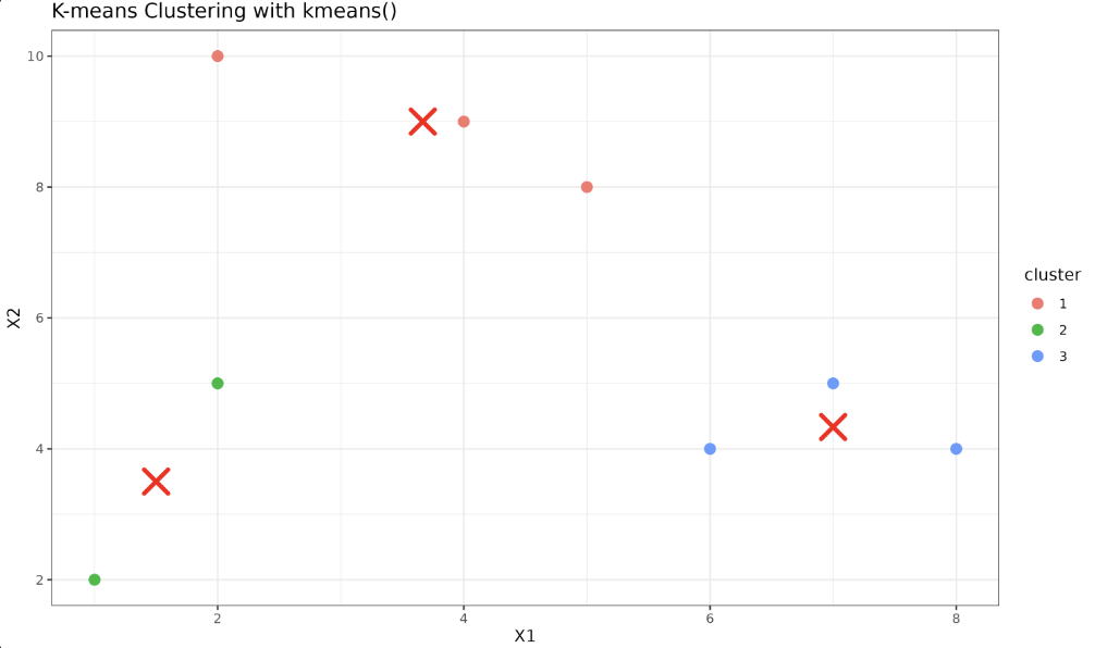 This shows our data points now clustered into three distinct clusters. It's important to note that while the kmeans() implementation automates many parts of K-means clustering, understanding the underlying processes and principles is crucial for better interpreting the results and troubleshooting, if necessary.