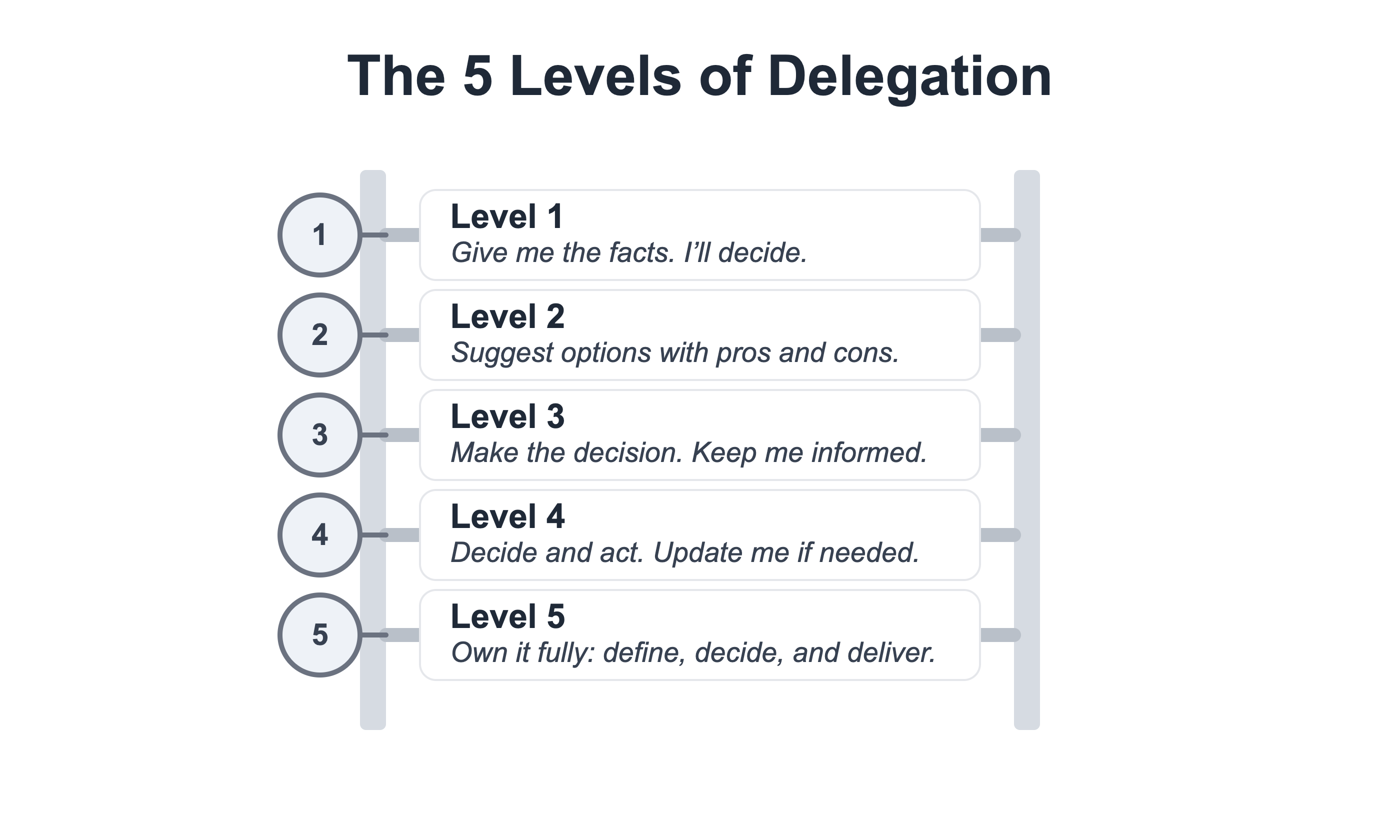 Note: The five levels of delegation were originally developed for people management, but the same principles apply to anyone who needs to share responsibility, assign tasks, or clarify ownership—whether or not you have formal authority. If you’re a project lead, a senior team member, or simply collaborating with others, you can use these levels to clarify expectations, support others’ growth, and ensure work gets done effectively. Throughout this lesson, when you see examples involving managers or direct reports, feel free to substitute your own context—these levels work for any situation where you’re handing off work or decisions to someone else.