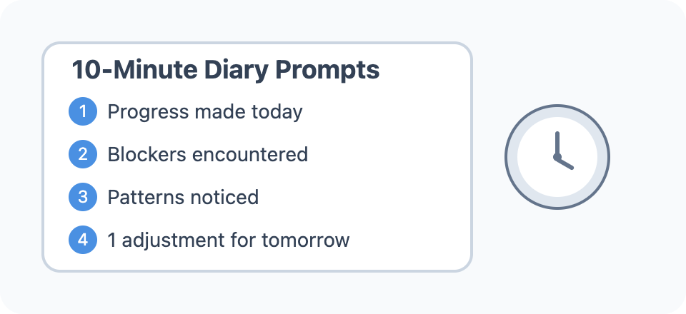 The 10-minute diary method turns the vague intention of "I should reflect more" into a concrete, sustainable practice. At the conclusion of your workday, try to spend about 10 minutes answering these four prompts: