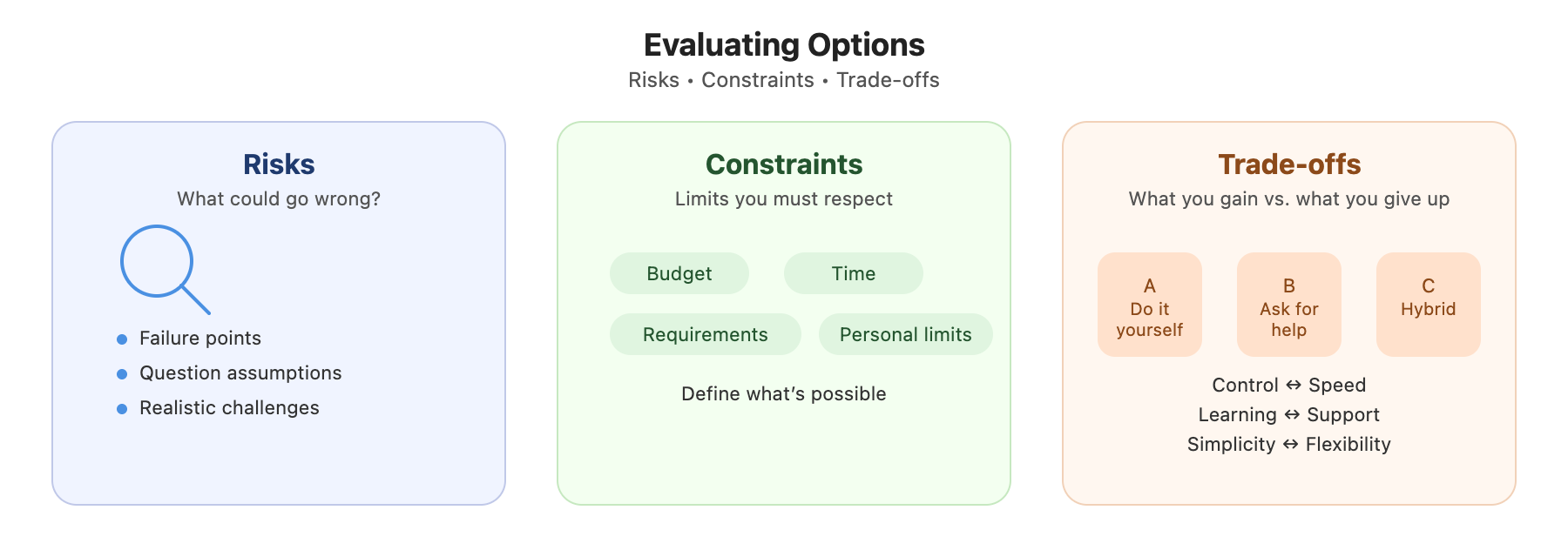 Every option carries hidden complexities that only emerge through deliberate analysis. While comparing options against criteria tells you how well each performs, examining risks, constraints, and trade-offs reveals what could go wrong and what you're sacrificing with each choice. This deeper layer of evaluation often determines whether a decision succeeds or fails in practice.