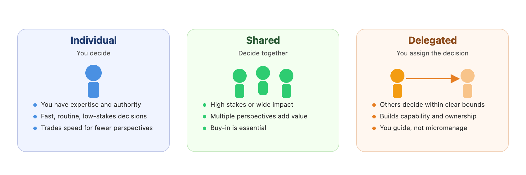 Not every decision belongs to the same person or requires the same process. The art of responsible decision-making begins with recognizing which decisions you should make alone, which require collaboration, and which you should delegate entirely. Getting this wrong creates bottlenecks, frustration, and missed opportunities—while getting it right accelerates progress and develops capability throughout your group.