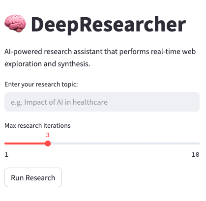 This basic page is the foundation for your DeepResearcher tool. In the next practice exercises, you’ll get hands-on experience building and customizing this page. Soon, you’ll be ready to add more advanced features and make your research assistant even smarter!