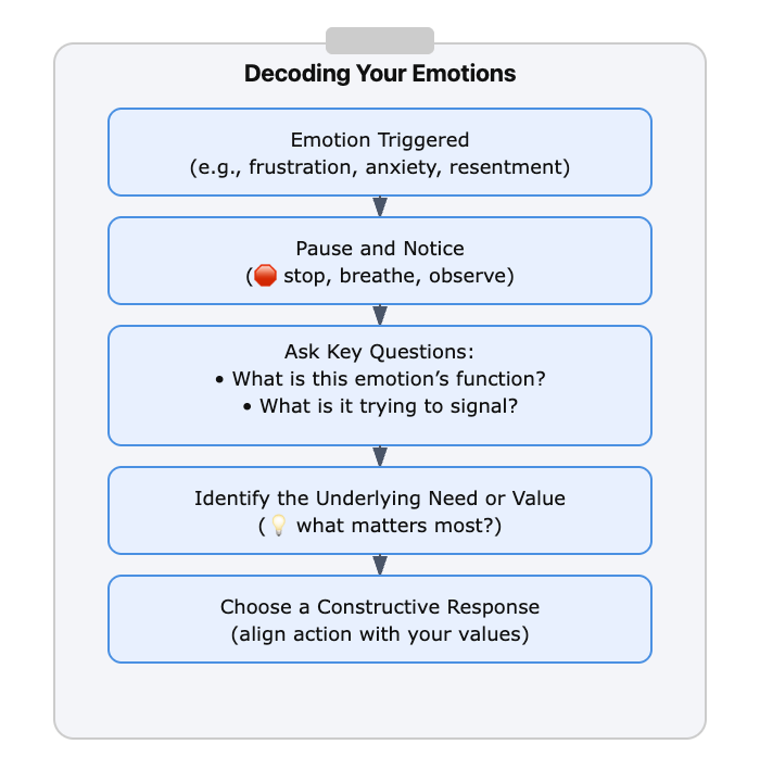 Understanding your emotions is just the first step—the next crucial phase is ensuring your response aligns with your deeper values rather than your immediate impulses. Our emotions can help us understand what matters most to us: love for family, ambition at work, fulfillment from helping others succeed, or peace from personal achievements. The challenge lies in focusing on these underlying values rather than getting swept away by surface-level emotional reactions.