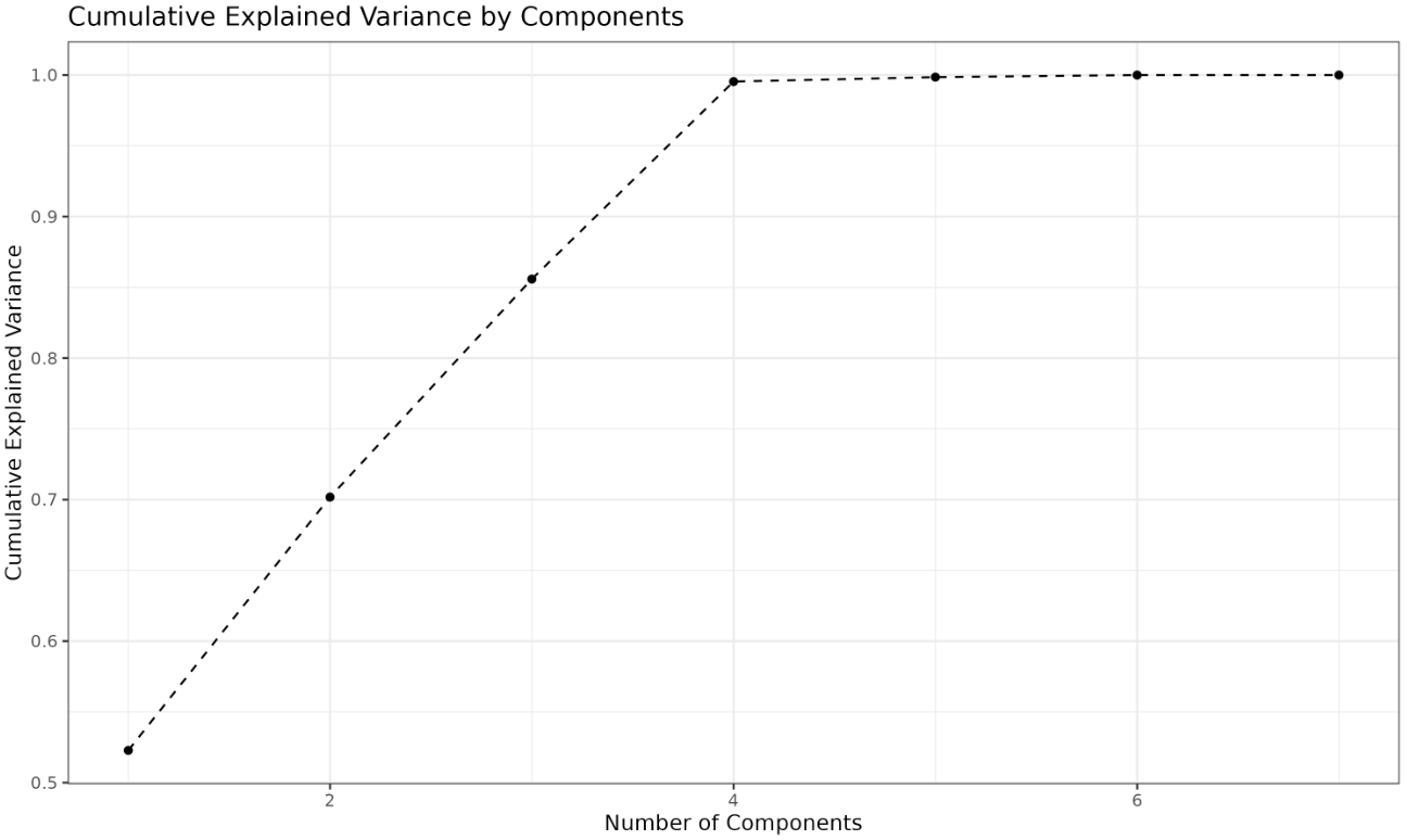The cumulative explained variance plot shows the total variance explained as you add more principal components. Each point represents the sum of the explained variances up to that component. This plot helps you determine the minimum number of components needed to reach a desired threshold of total variance (such as 95%). For example, if the curve crosses 0.95 at the fourth component, you know that the first four components together explain at least 95% of the variance in your data. This is a practical way to balance dimensionality reduction with information retention.