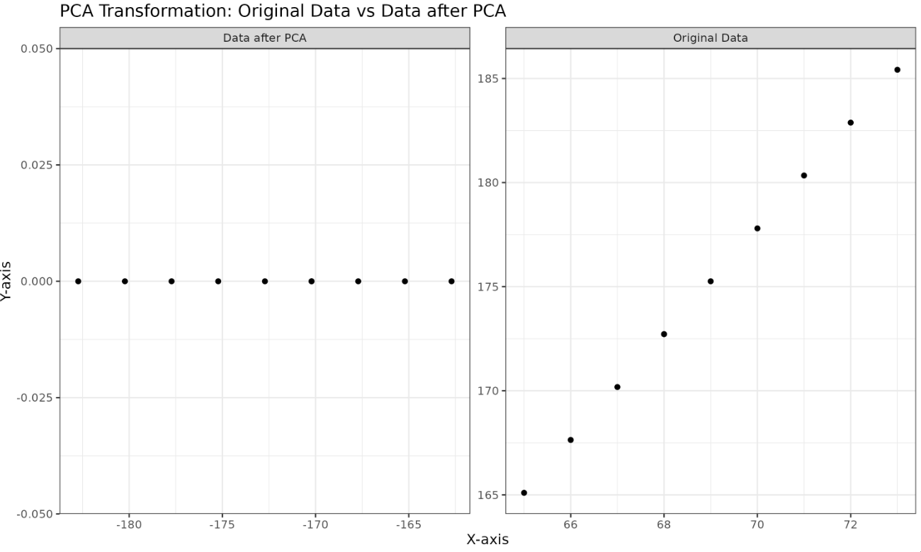Let's use PCA to combine the two height features into a single principal component. We'll use ggplot2 and facet_wrap to visualize both the original data and the data after PCA side by side.