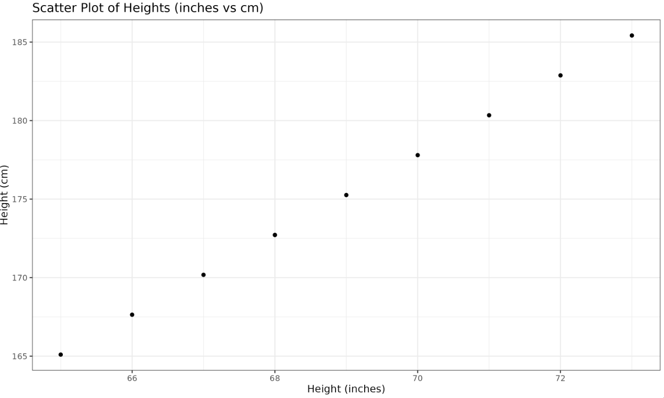 We show a scatter plot of height in inches versus centimeters, revealing the redundancy as the data points line up in a straight line.