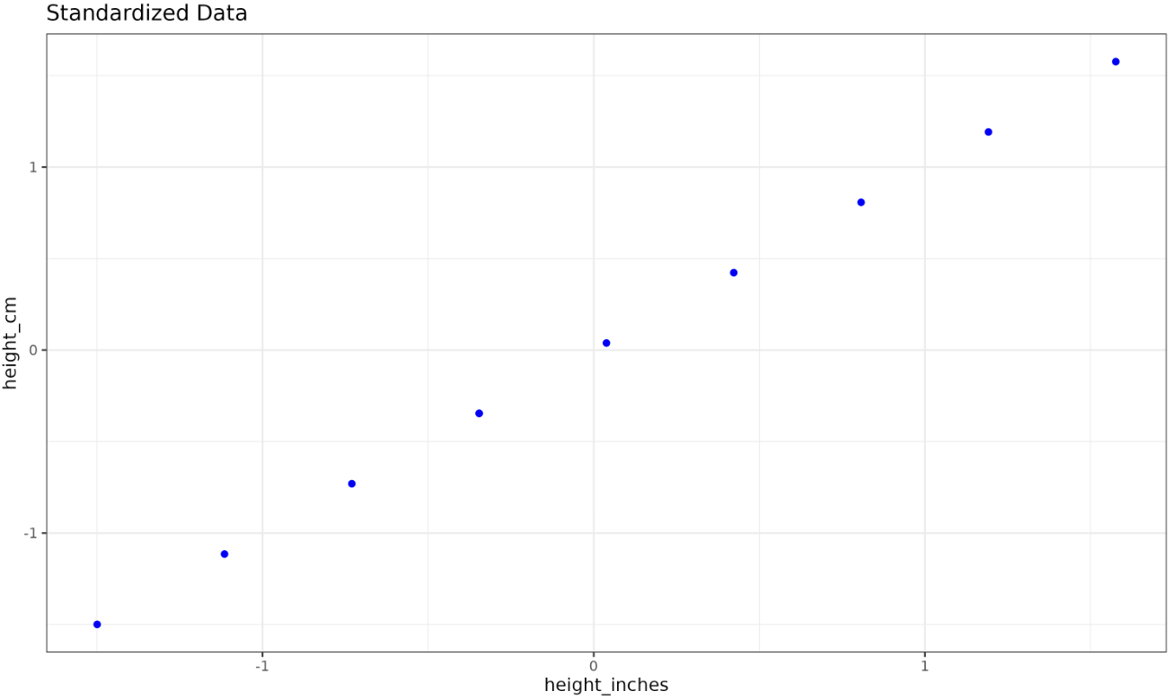 Let's standardize just the two height columns in our dataset using R's scale() function and visualize the standardized data using ggplot2: