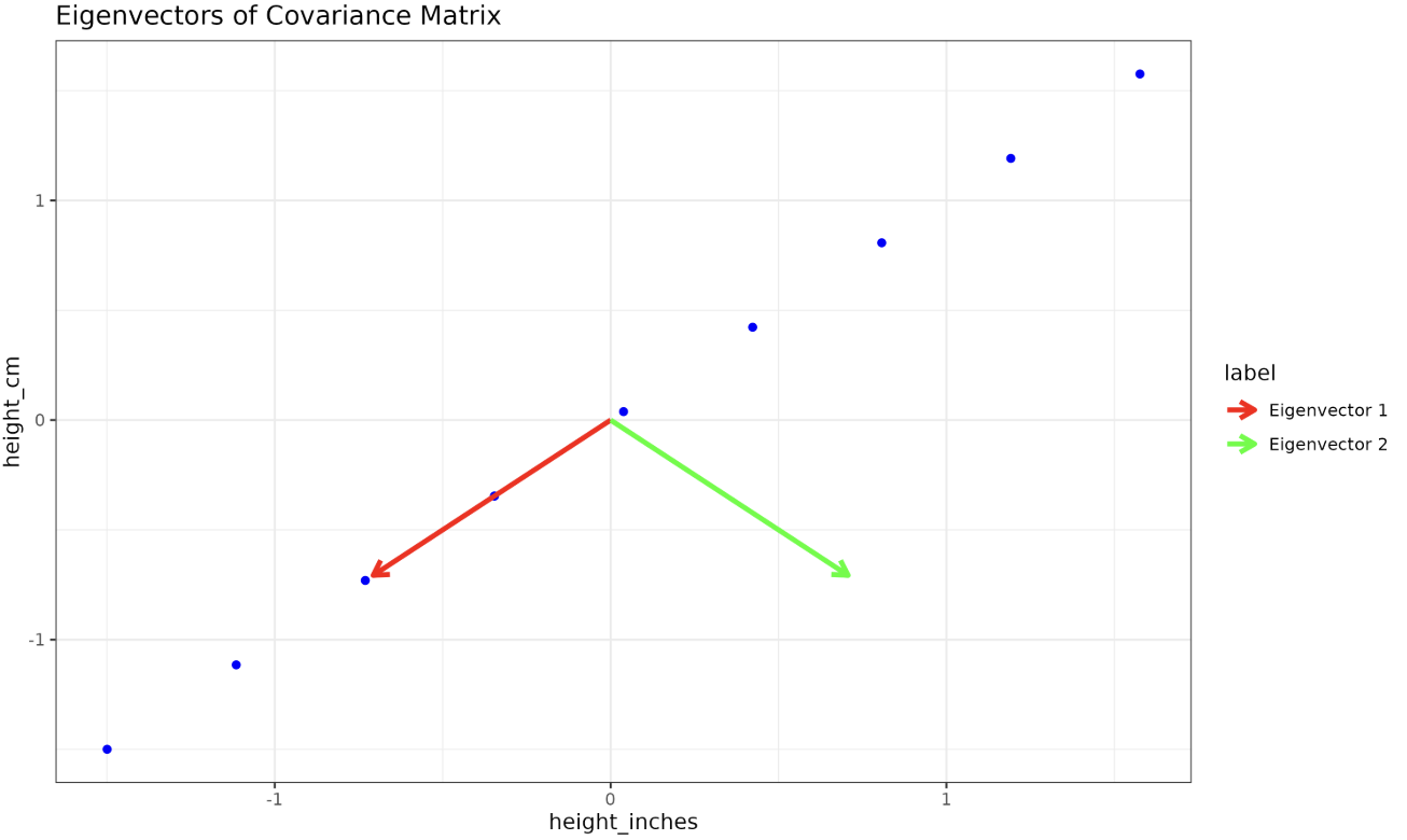 The red line corresponds to the eigenvector associated with the first eigenvalue, which captures the direction of maximum variance in the data. The green line represents the eigenvector associated with the second eigenvalue, capturing the direction of the second highest variance.