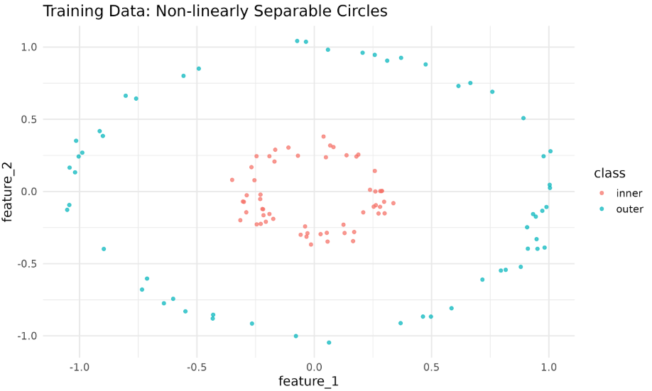 The plot above shows the two classes forming concentric circles that are not linearly separable.