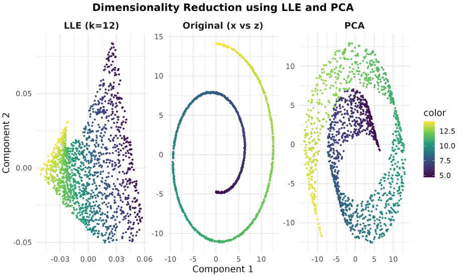In this lesson, we’ll unpack the LLE algorithm, discuss when to use it, and contrast it with PCA. We’ll implement it in R, using ggplot2 for visualization and a small helper we’ll write to run LLE.