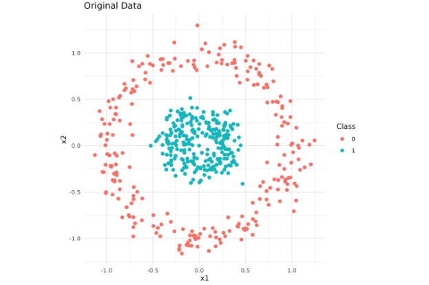 Note: Results can differ slightly due to randomness in initialization and implementation details. If you prefer the original mlbench.circle, expect less separation (smaller radial gap). The above generator mirrors make_circles(factor=0.3, noise=0.1) to make the effect of parameter tuning more visible.