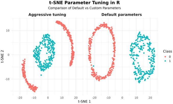 We can compare the results of t-SNE with default parameters and custom ones side by side using facets in ggplot2.