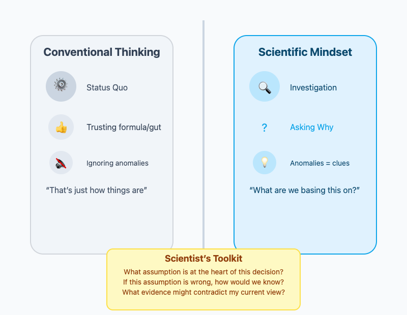 Small anomalies are opportunities, not annoyances. A few unexpected complaints or a surprising result are clues to investigate, not just noise to ignore. Put simply: adopt informed skepticism, not cynicism. Instead of reflexively shooting down ideas, press for the “why” behind beliefs and look for real-world confirmation.