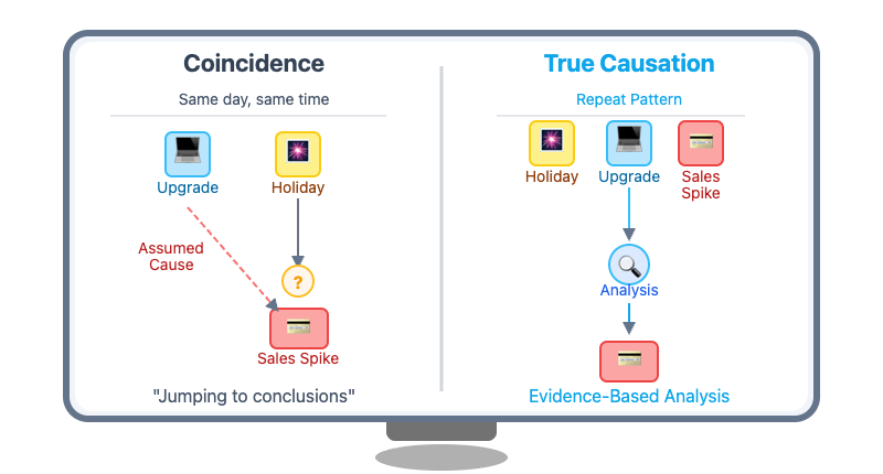 Try using counterfactual thinking: Would this outcome have happened without the change? Imagine a company upgrades its website on the same day a major holiday shopping season begins. Sales immediately spike, and the team credits the new website design for the surge. However, by comparing sales patterns from previous years, they realize that sales always jump during this season, regardless of changes to the website. By considering other possible explanations and looking at evidence across different time frames, the team avoids overstating the impact of their website changes and can make better-informed decisions about future investments.
