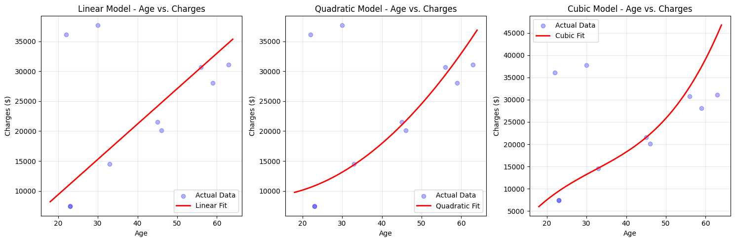 Visualization is a powerful way to understand how well your models are capturing the patterns in the data. Here, we will plot the actual insurance charges against the predicted charges for different models, focusing on the age