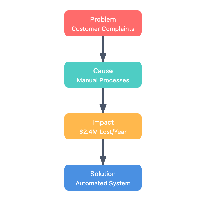 Your story needs a well-defined narrative arc that guides stakeholders through the journey. Start by establishing the current state and its consequences, then introduce the path toward resolution. For instance, if you're addressing inventory management issues, your arc might flow from `"incorrect counts disrupting production" through "discovery of root causes in manual processes" to "systematic solution that prevents future errors." This structure helps stakeholders understand not just what you're proposing, but why it matters and how it connects to business outcomes. The visual flow below demonstrates how storytelling might apply in a real-world scenario: