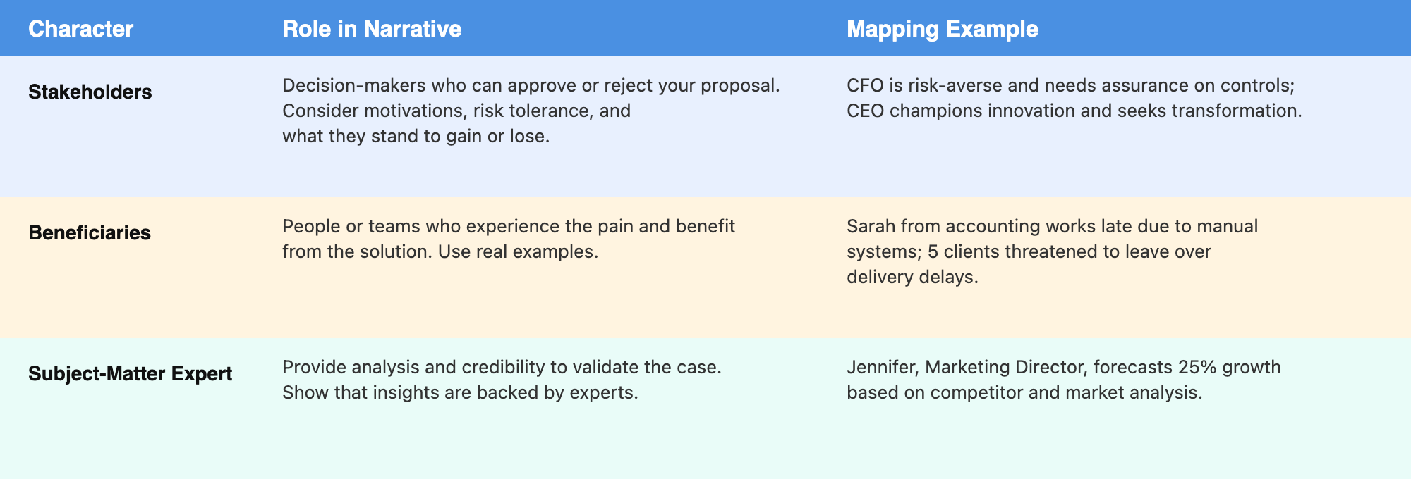 Just as every story needs compelling characters, your business case must clearly identify the people involved in and affected by your proposal. The HBR Guide emphasizes the following three critical groups of characters, each playing distinct roles in your narrative:
