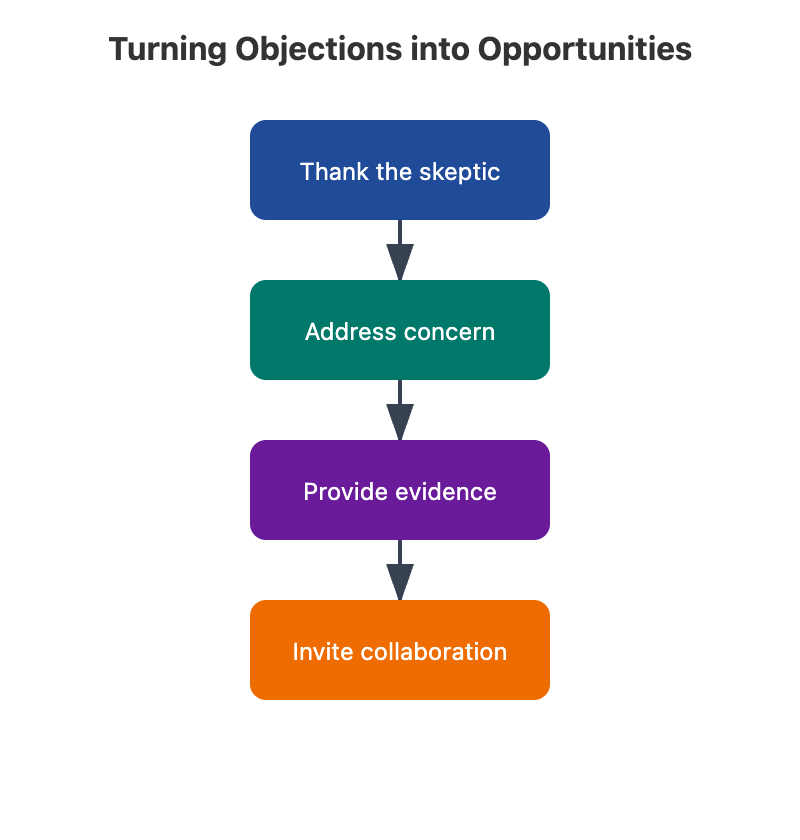 Resistance is inevitable. One effective approach is to “invite the lions in” by thanking skeptics and engaging them directly. This demonstrates confidence and can turn adversaries into allies. Before we look at a real-world example, review the diagram below. It illustrates the process of turning objections into opportunities by engaging skeptics, addressing their concerns, and inviting their expertise into the solution: