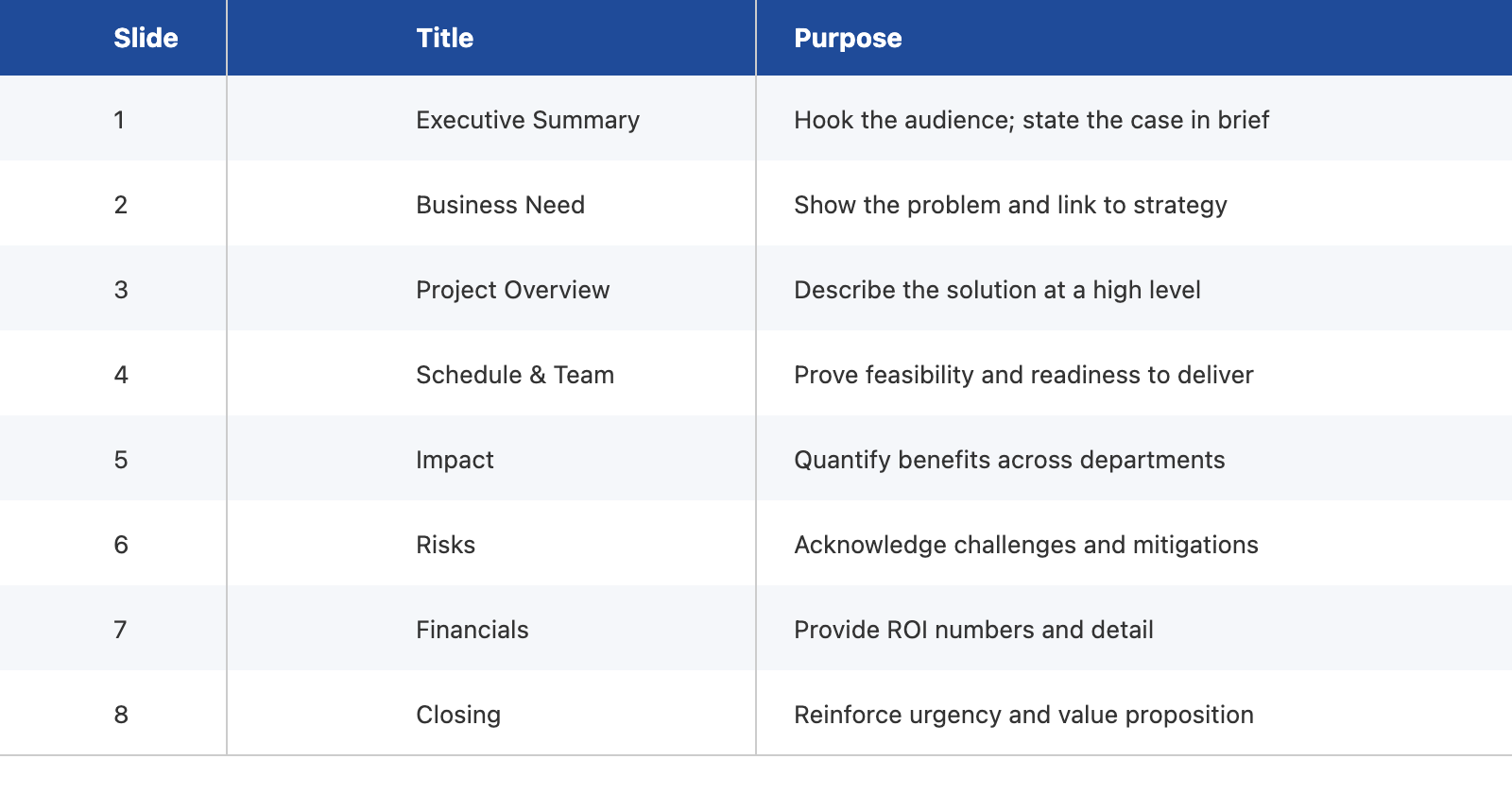 Once you've hooked your audience with a powerful executive summary, you need a logical structure that builds your case systematically. The following chart contains an eight-slide framework that has proven effective across industries and company sizes. This isn't about limiting yourself to exactly eight slides, but rather ensuring you cover eight essential elements in a sequence that makes sense to decision makers.