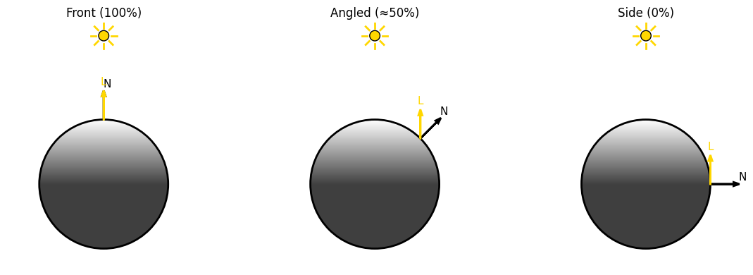 The core of diffuse lighting lies in a simple yet powerful mathematical concept: the between the surface normal and the direction toward the light source. This dot product gives us the cosine of the angle between these two vectors, which directly corresponds to the intensity of diffuse illumination.