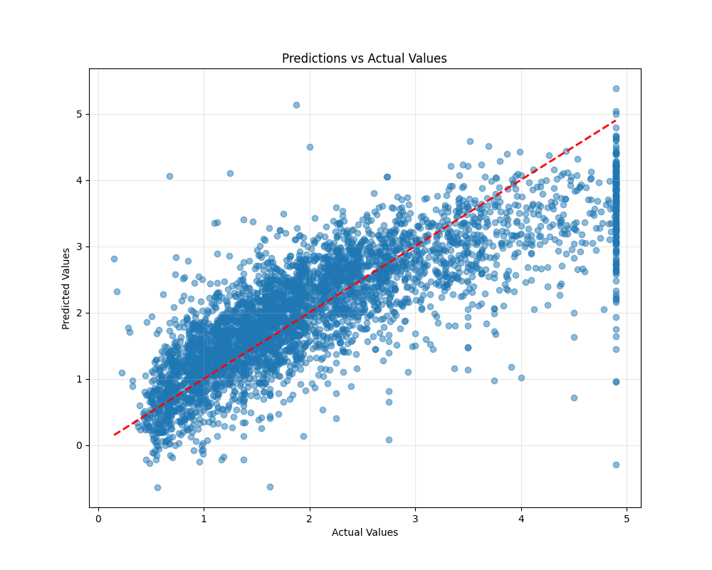 This code creates a scatter plot where each point represents a test sample. The x-axis shows the actual house values, and the y-axis shows the predicted values. The red dashed line is the reference line where predictions would be perfect. The closer the points are to this line, the better our model is performing.
