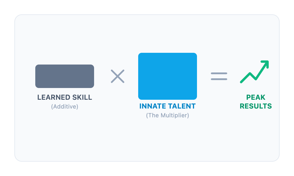 Why does this matter? Because talents are your multipliers. When you invest skill development on top of a natural talent, you get exponential returns. When you invest time building a skill in an area where you have no underlying talent, you get competence at best. The goal isn't to ignore skills — it's to know which of your abilities are powered by something deeper.
