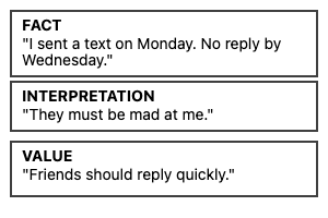 Here's a practical way to separate these three elements in your daily life. When something happens that triggers a strong reaction, pause and ask yourself three questions. First, consider what actually happened that a video camera would have recorded. This gives you the facts. Second, identify what story you're telling yourself about what this means to reveal your interpretation. Third, examine what you think should happen or what you wish were different. This shows your values.