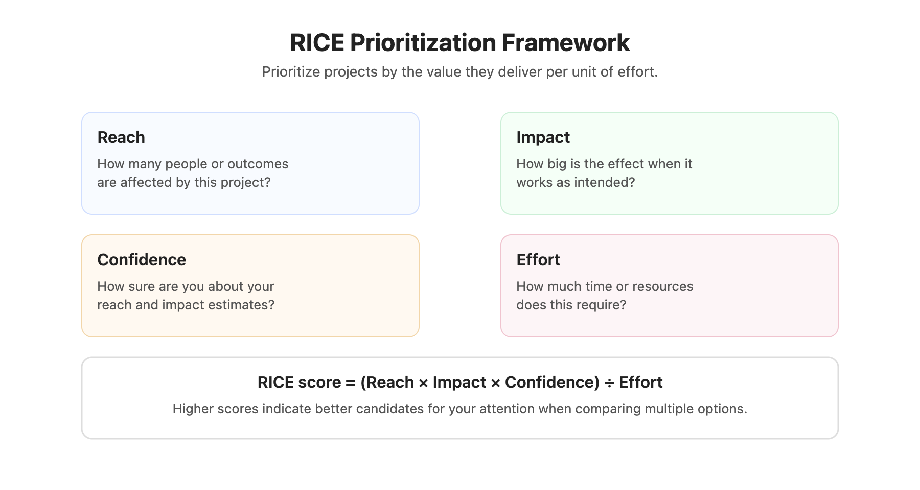 RICE stands for Reach, Impact, Confidence, and Effort and is a . For each potential task or project, you estimate how many people or outcomes it affects (Reach), how significant the effect will be (Impact), how certain you are about your estimates (Confidence), and how much time or resources it requires (Effort). You then calculate a score using the formula (Reach × Impact × Confidence) / Effort. Higher scores indicate better candidates for your attention. RICE works particularly well when you have multiple competing initiatives and need a rational way to compare them.