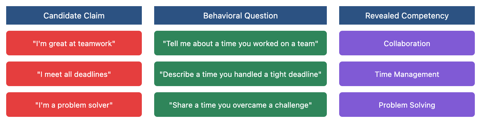 The table below provides additional examples of how candidate claims can be verified through behavioral interview questions.