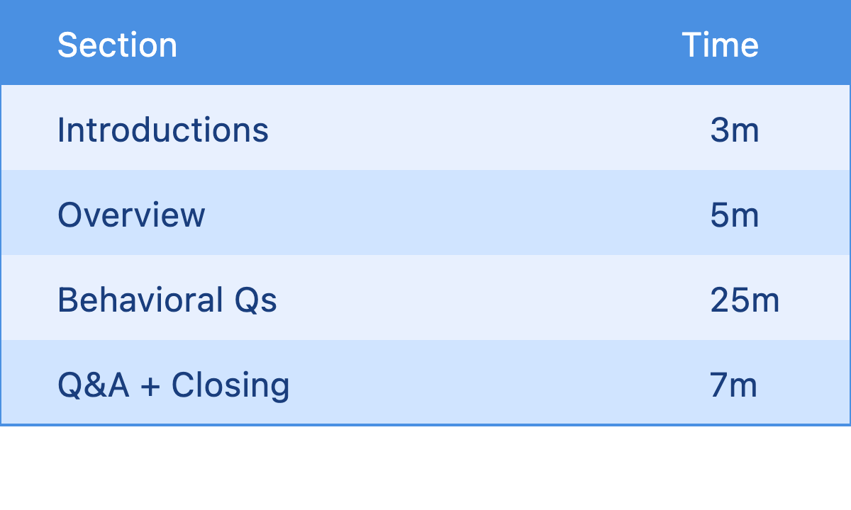 After a short introduction to the company and role, devote the majority of your time (about 20–25 minutes) to behavioral questions and follow-ups. Wrap up by inviting the candidate’s questions and clearly explaining next steps, such as: "We’ll finish interviews this week and aim to update you by next Friday."