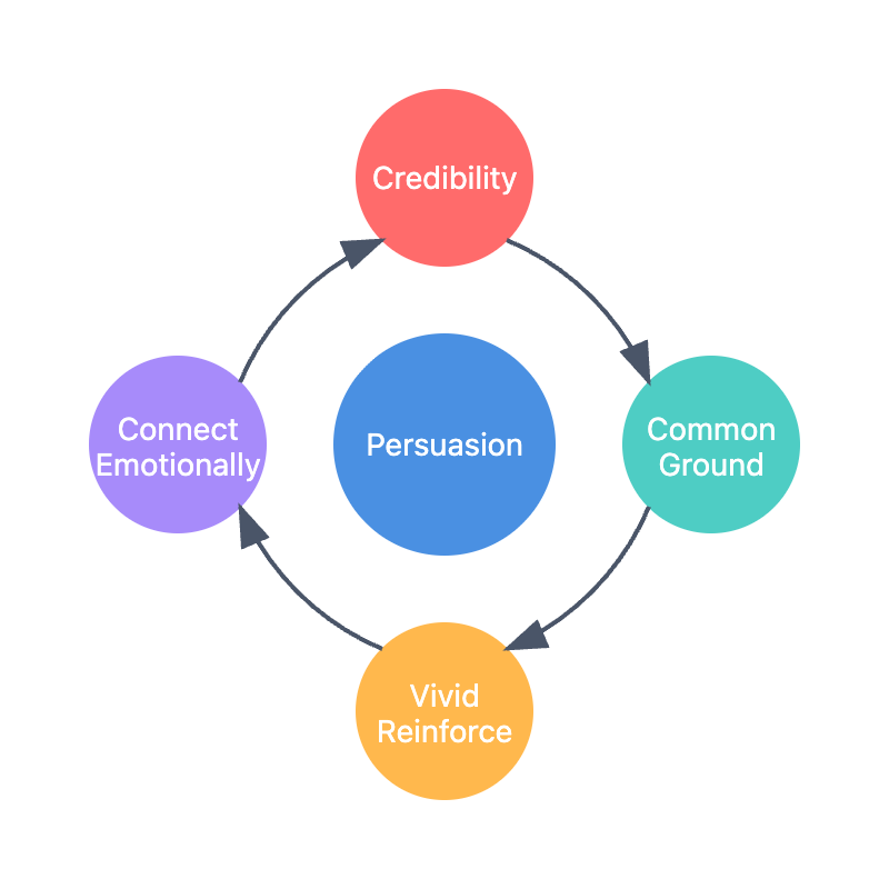 Jay Conger's research in the HBR Guide to Managing Up and Across reveals that effective persuasion isn't manipulation or aggressive selling—it's a learning and negotiating process that leads colleagues to a shared solution. These insights show that master persuaders follow a predictable four-step process: establishing credibility, framing goals on common ground, reinforcing positions vividly, and connecting emotionally with their audience.