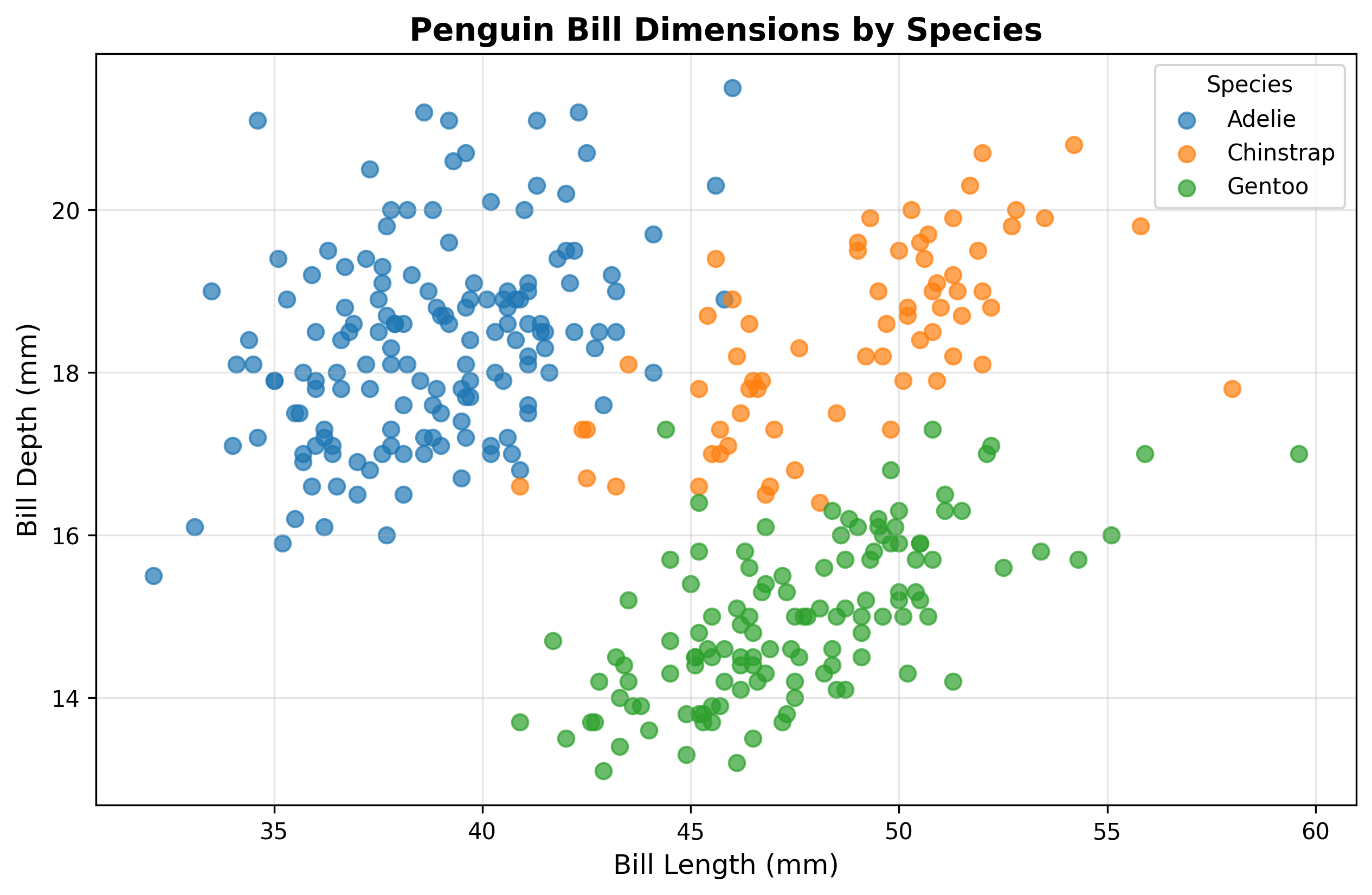 The resulting visualization reveals the distinct clustering patterns Claude described. The three species occupy different regions of the plot, showing that bill proportions — not just overall size — vary systematically between species: