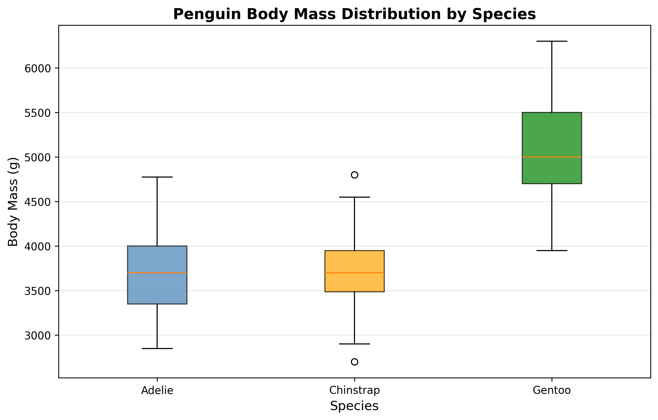The box plot shows the body mass distributions Claude analyzed, with each species represented by its assigned color. The boxes show the middle 50% of data (quartiles), the lines inside represent medians, and the whiskers extend to show the full range: